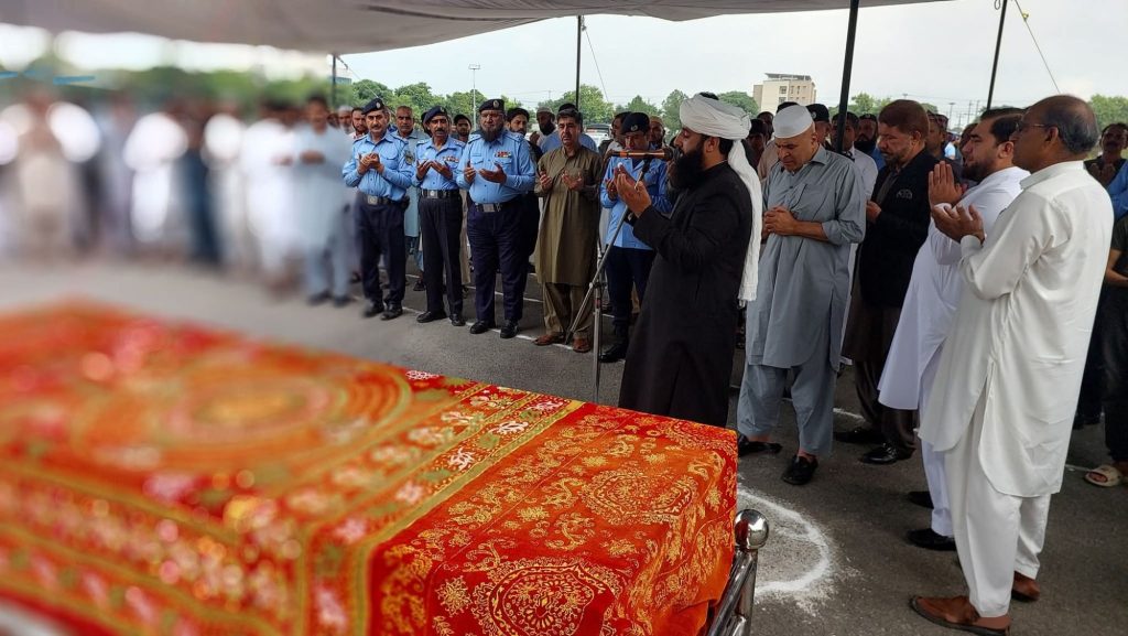 اسلام أباد( کرائم رپورٹر)پی ایم ھاوس میں تعینات ایس پی طاھر خان کی والدہ ماجدہ کا انتقال ھوگیا۔ نمازجنازہ اسلام آباد پولیس لائن میں ادا کی گئ طاھر خان نے اپنی والدہ کا جنازہ خود پڑھایا نماز جنازہ میں وفاقی پولیس کے افسروں جوانوں اور عزیزو اقارب نے شرکت کی نماز جنازہ کے بعد مرحومہ کی میت کو آبائی علاقے پشاور روانہ کیا گیاا