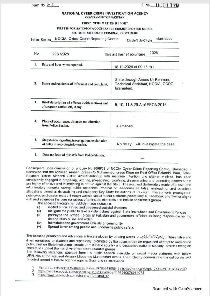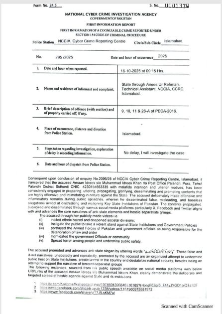 این سی سی آئی اے نے پاکستان مخالف تقریر پر و سوشل میڈیا پر اپ لوڈ کرنے پر پیکا قانون 2016 کی دفعات 9.10.11 26 A کے تحت ایف آئی آر درج کر لی ۔ذریع کے مطابق سوشل میڈیا پر عوام کو اشتعال دینے والے افراد کے خلاف بھی ایسی قانون کے تحت مزید ایف آئی آر ز کے ادراج کا امکان ہے