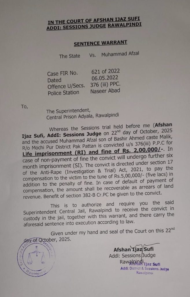 راولپنڈی( کورٹ رپورٹر )ایڈیشنل سیشن جج افشاں اعجاز صوفی نے تھانہ نصیر آباد میں درج کیس کا فیصلہ سنا دیا مجرم محمد افضل پر الزام عائد تھا اس نے مسجد کے اندر طالبعلم کو بدفعلی کا نشانہ بنایا ہے جس پر پولیس نے مقدمہ درج کیا تھا عدالت نے جرم ثابت ہونے پر مجرم محمد افضل کو عمر قید کی سزا، 5 لاکھ روپے ہرجانے اور 2 لاکھ روپے جرمانے کی بھی سزا سنائی ہے واقعہ کا مقدمہ مئی 2022 تھانہ نصیر آباد میں درج کیا گیا تھا