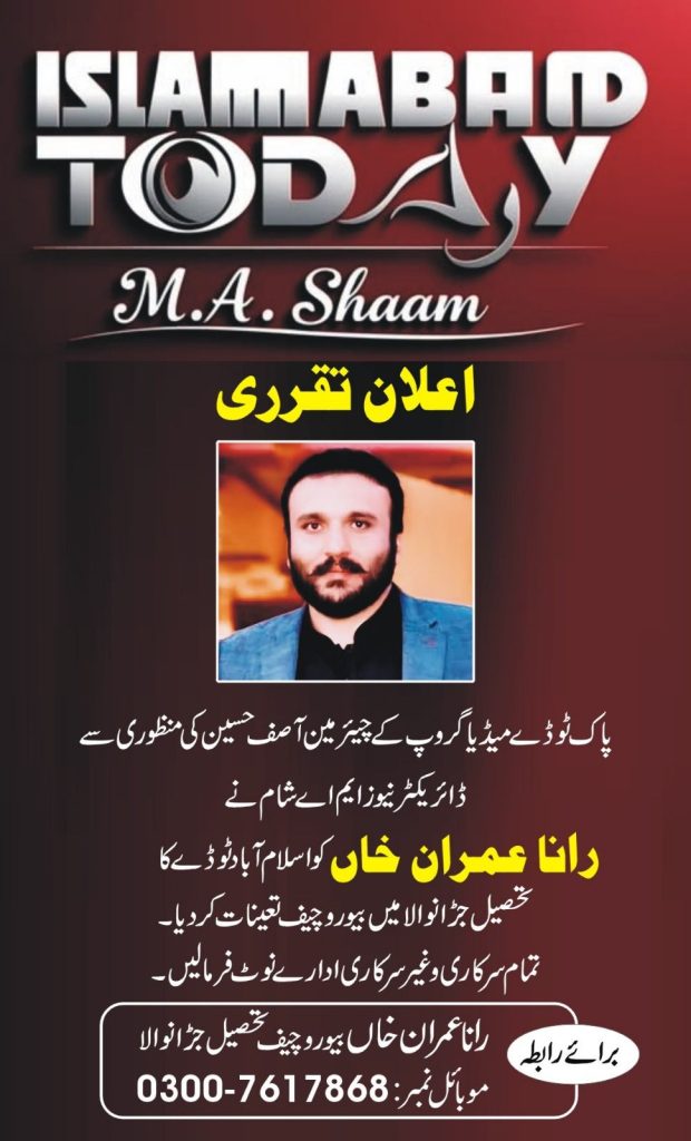 پاک ٹوڈے میڈیا گروپ انٹرنیشنل کے چیئرمین اصف حسین اور ڈائریکٹر نیوز ایم اے شام نے رانا عمران خاں کو تحصیل جڑانوالا کا بیورو چیف مقرر کر دیا ہے تمام سرکاری و نیم سرکاری ادارے نوٹ فرما لیں خبروں اور اشتہارات کے لیے براہ راست بیورو چیف عمران خاں سے رابطہ کریں
