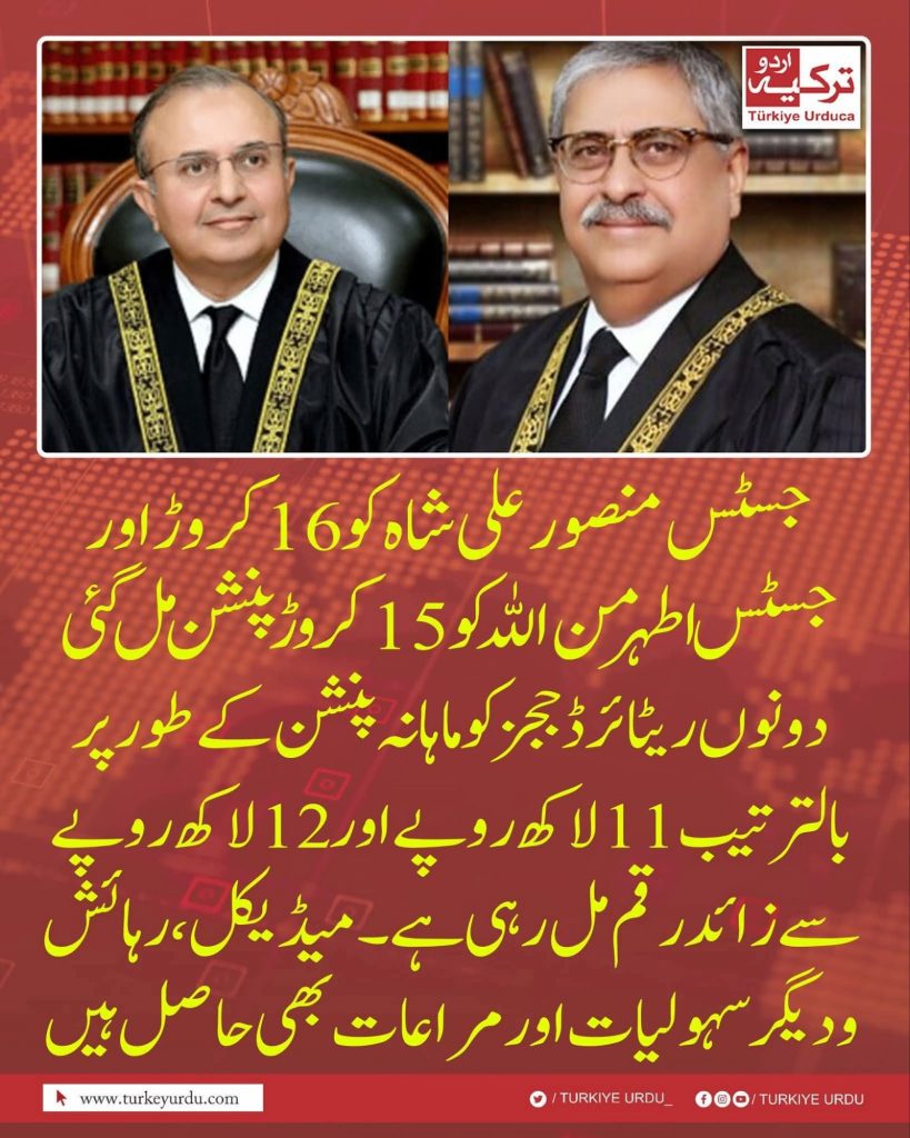 اسلام اباد( ایم اے شام )دنیا بھر میں انصاف فراہم کرنے والی ہماری عدلیہ جو کہ139 ویں نمبر پر ہے کے دو مستعفی ججز پر جب حکومت نوٹوں کی بارش کردے تو سمجھ جاؤ کہ پوری دال ہی کالی ہےجسٹس منصورعلی شاہ کو 16 کروڑ اور جسٹس اطہر من اللہ کو 15 کروڑ پنشن مل گئی ،دونوں ریٹائرڈ ججز کو ماہانہ پنشن کے طور پر بالترتیب 11 لاکھ روپے اور 12 لاکھ روپے سے زائد رقم مل رہی ہے۔ میڈیکل، رہائش ودیگر سہولیات اور مراعات بھی حاصل ہیں۔