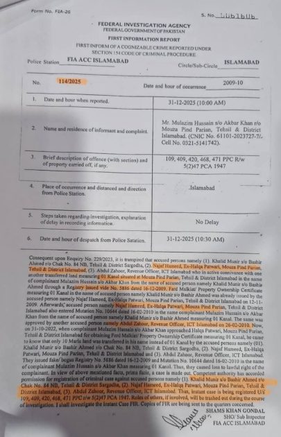 اسلام اباد( کرائم رپورٹر )ایف آئی اے اسلام آباد کے اینٹی کرپشن سیل میں سابق ڈی جی آئی ایس آئی لیفٹیننٹ جنرل (ر) فیض حمید کے بھائی نجف حمید اور دیگر افراد کے خلاف غیر قانونی طور پر قیمتی سرکاری زمین منتقل کرنے کے الزام میں مقدمہ درج کر لیا گیا ہے، مقدمہ ملازم حسین آف پنڈ پڑیاں کی مدعیت میں درج کیا گیا جس میں نجف حمید، سابق ریونیو افیسر اسلام آباد عبدالظہور اور سہولت کار خالد منیر کو بطور ملزمان نامزد کیا گیا ہے، مدعی کے مطابق ملزمان نے ملی بھگت کے ذریعے ایک کنال قیمتی اراضی غیر قانونی طور پر خالد منیر کے نام منتقل کی، ایف آئی اے حکام کا کہنا ہے کہ معاملے کی باقاعدہ تفتیش شروع کر دی گئی ہے اور تمام پہلوؤں کا جائزہ لینے کے بعد قانون کے مطابق کارروائی عمل میں لائی جائے گی۔