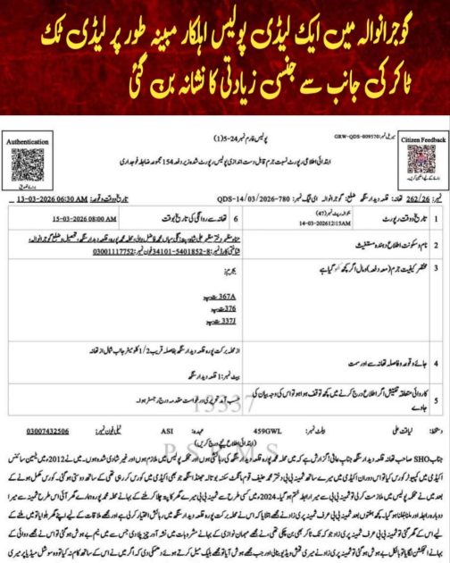 گوجرانوالہ (کرائم ووٹر )گوجرانوالہ میں ایک لیڈی پولیس اہلکار مبینہ طور پر لیڈی ٹک ٹاکر کی جانب سے جنسی زیادتی کا نشانہ بن گئی۔ واقعے کا مقدمہ درج کر لیا گیا ہے جبکہ پولیس نے تحقیقات شروع کر دی ہیں متاثرہ لڑکی نے بتایا کہ اس کی دوست کے ساتھ کافی عرصے بعد ملاقات ہوئی تھی جس نے مجھے بہانے سے اپنے گھر بلایا اور انجیکشن لگا کر مجھے بے ہوش کر کے میری فحش ویڈیو بنا کر میرے ساتھ زیادتی کی اور مختلف اوزار استعمال کیے پولیس نے مقدمہ درج کر کے تفتیش شروع کر دی ہے