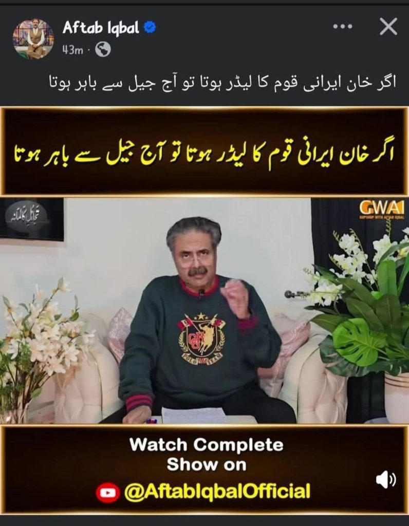 افتاب اقبال نامی بھانڈ کبھی بھی صحافی نہیں رہا مختلف ٹی وی چینل پہ مراثیوں والے شو کر کے شہرت تو مل گئی لیکن وہ عزت وہ تکریم کبھی نہ مل سکی جو اس کے باپ کو ملی اج کل اپنی ویور شپ کے لیے پاکستان کے خلاف ب* کرنا اپنا فرض اولین سمجھتا ہے ڈرامہ تو وہ کرتا ہے کہ وہ عمران کے ساتھ ہے لیکن حقیقت یہ ہے کہ افتاب اقبال سمیت چار پانچ جو یوٹیوبر ہیں وہ عمران کی محبت میں پاکستان کے خلاف ب* نہیں کر رہے بلکہ میں یہ کہوں گا کہ وہ عمران کے بھی دشمن ہیں یہ چند گماشتے صرف اور صرف اپنا فائدہ دیکھ رہے ہیں اور چند ہزار ڈالروں کے لیے اپنی ماں تک کو بیچنے کے لیے تیار رہتے ہیں افتاب اقبال کے بارے میں صرف اتنا لکھوں گا کہ وہ اچھے باپ کا ایک گندا بیٹا ہے