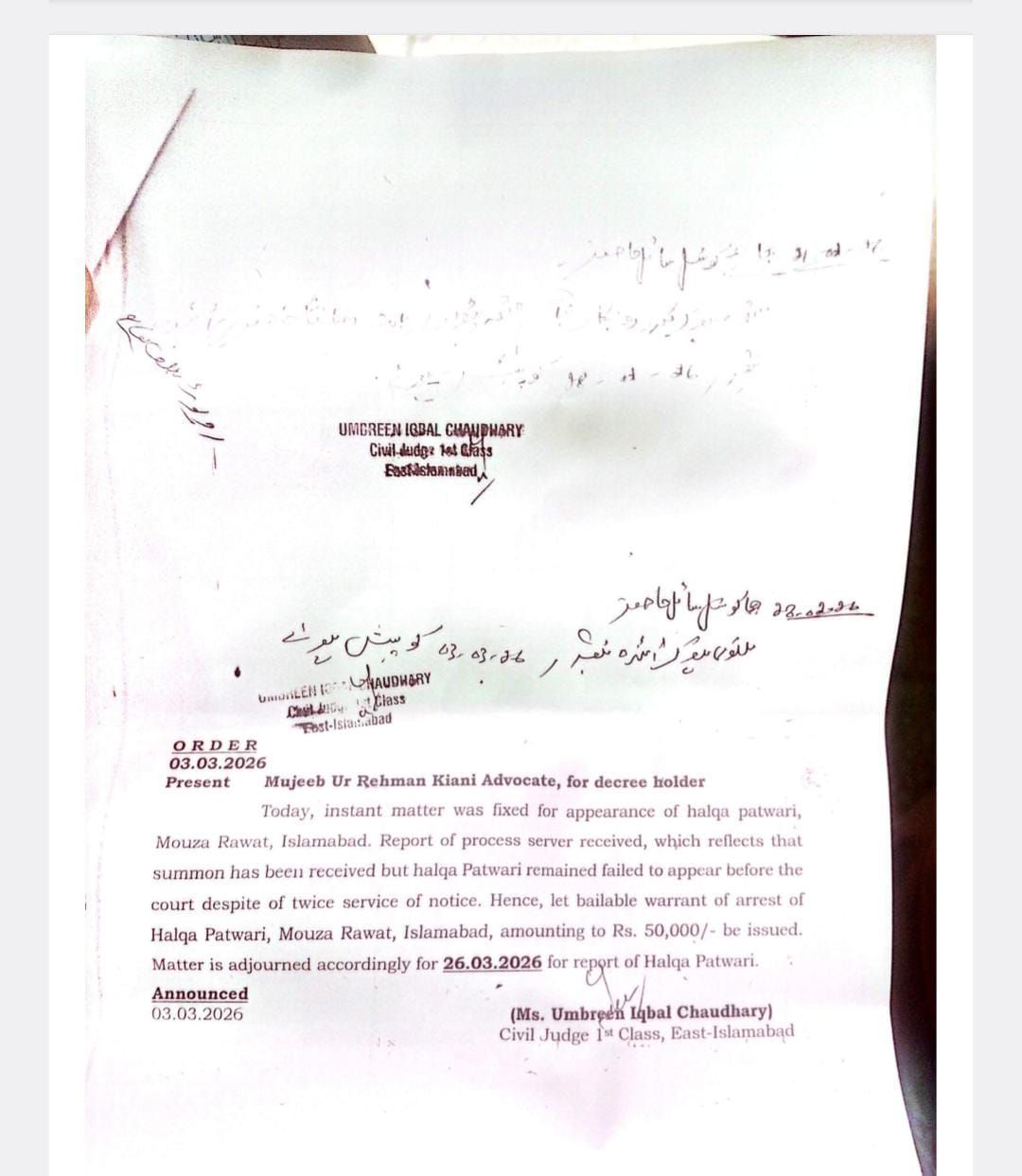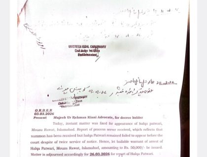 حلقہ پٹواری روات کی عدم پیشی پر وارنٹ گرفتاری جاری، ڈگری ہولڈر مبشر صدیق کی جانب سے وکیل مجيب الرحمن کیانی ایڈووکیٹ عدالت میں پیش ..مزید پڑھیں