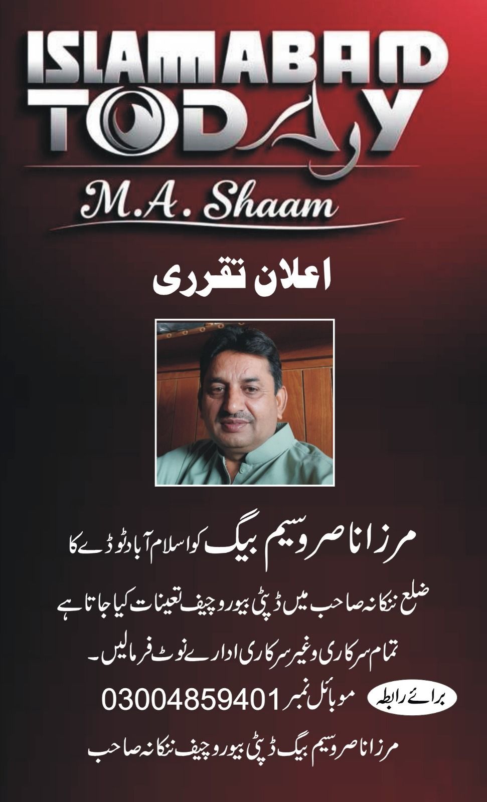 اسلام اباد (سپیشل رپورٹ )پاک ٹوڈے ۔میڈیا گروپ کے چیئرمین اصف حسین کی منظوری سے پاکستان میں تعینات ڈائریکٹر نیوز ایم اے شام نے مرزا ..مزید پڑھیں