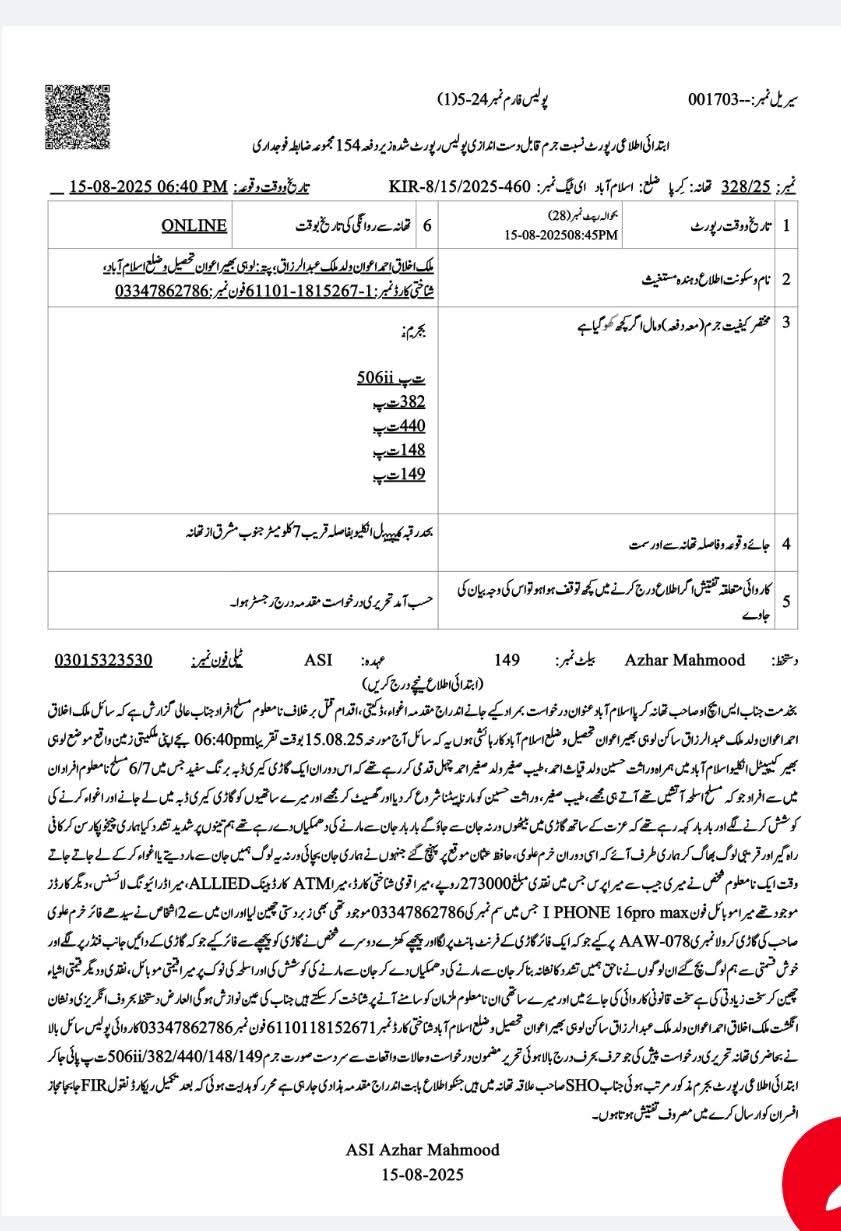 اسلام آباد (کرائم رپورٹر) تھانہ کرپا کی حدود کیپٹل انکلیو میں خوفناک واردات، چھ سے سات نامعلوم مسلح افراد نے شہریوں پر حملہ کر دیا۔ ..مزید پڑھیں